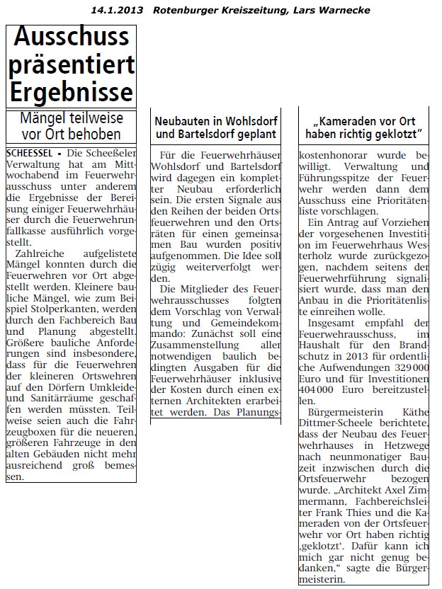 Scheessel : Rathaus : öff. Sitzung des Feuerwehrausschusses Themen: Bericht der Bürgermeisterin Einwohnerfragestunde Haushalt 2013 - Beratung der Produkte im Bereich Brandschutz und öff. Ordnung Anfragen und Anregungen |